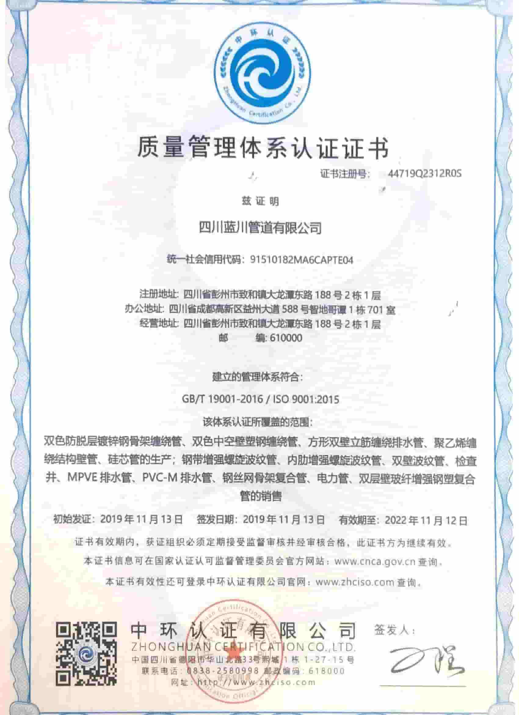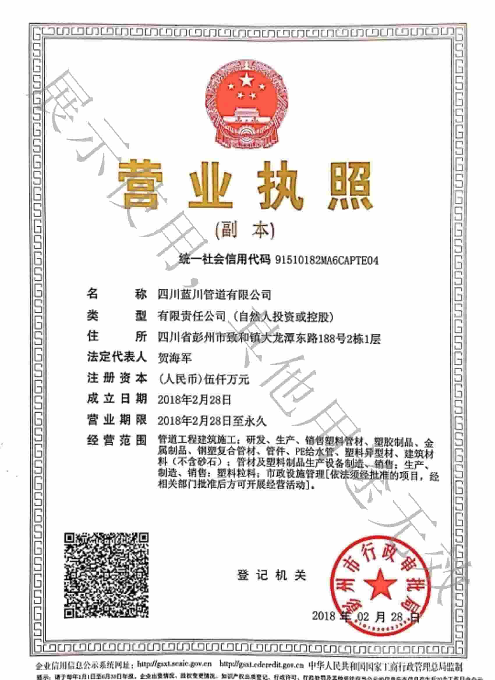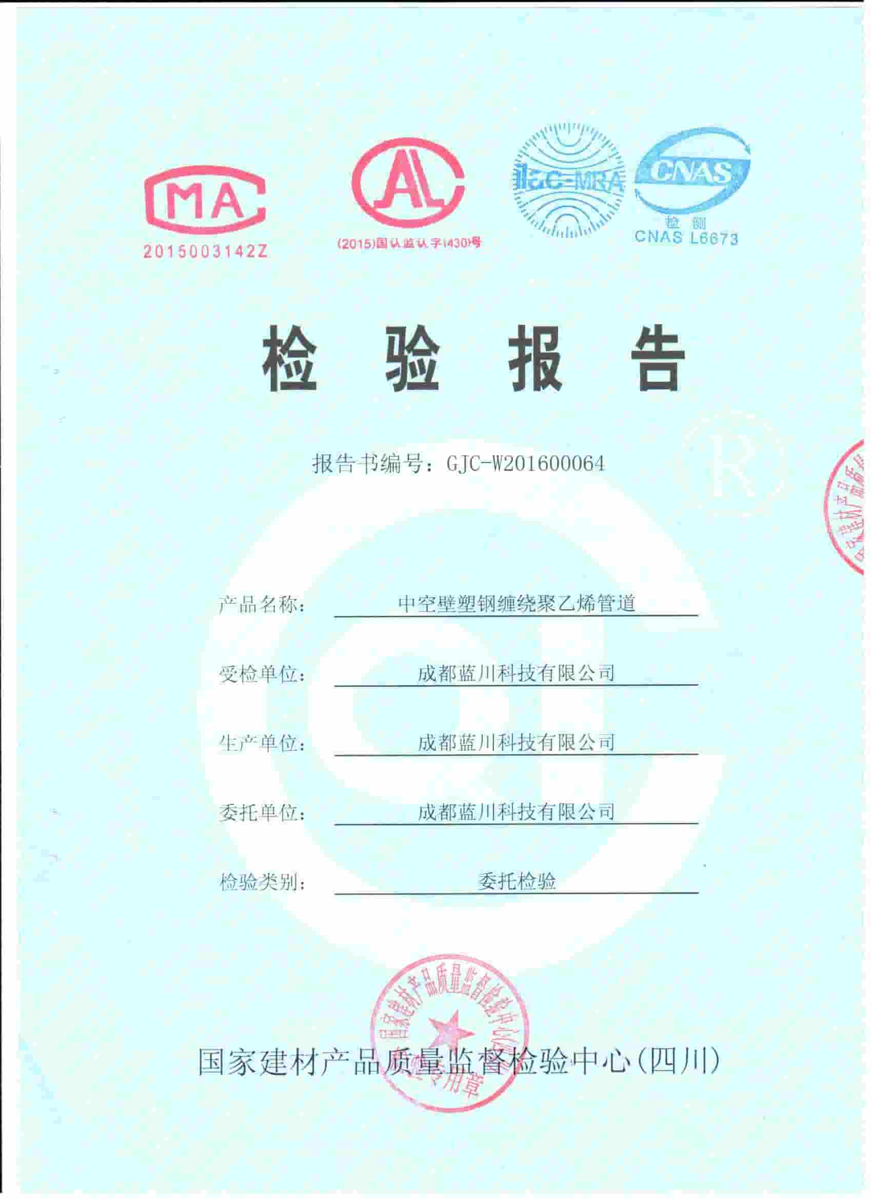 四川藍(lán)川管道有限公司(成都藍(lán)川科技有限公司)成立于2012年,生產(chǎn)基地坐落于“牡丹之城”四川彭州市工業(yè)開(kāi)發(fā)區(qū),營(yíng)運(yùn)中心位于成都市高新區(qū)益州大道,注冊(cè)資本5仟萬(wàn),占地面積2萬(wàn)余平米,年生產(chǎn)能力達(dá)1萬(wàn)噸以上;是一家專(zhuān)業(yè)研發(fā)、生產(chǎn)、銷(xiāo)售新型市政工程管道的高新技術(shù)企業(yè)。目前擁有大型市政排水管生產(chǎn)線(xiàn)5條,給水管生產(chǎn)線(xiàn)5條,電力管生產(chǎn)線(xiàn)2條。主要產(chǎn)品有:防脫層鍍鋅鋼骨架纏繞管、雙層壁克拉管、雙色中空壁塑鋼纏繞管、方形雙壁立筋纏繞管、內(nèi)肋管、雙壁波紋管、給水管、電力管、硅芯管等。 公司是四川省湖南商會(huì)“常務(wù)副會(huì)長(zhǎng)單位”和“創(chuàng)新湘商”,中國(guó)塑料加工工業(yè)協(xié)會(huì)“塑料管道專(zhuān)業(yè)委員會(huì)會(huì)員單位”,獲得了30余項(xiàng)發(fā)明專(zhuān)利和實(shí)用新型專(zhuān)利,2020年評(píng)為《高新技術(shù)企業(yè)》,公司通過(guò)了《質(zhì)量管理體系認(rèn)證證書(shū)ISO9001:2015》,《職業(yè)健康安全管理體系認(rèn)證證書(shū)OHSAS18001:2018》,《環(huán)境管理體系認(rèn)證證書(shū)ISO14001:2015》;公司于2019年主編了《雙色防脫層玻璃纖維增強(qiáng)鍍鋅鋼骨架纏繞管》T/SCSX0906-2019,《雙壁纖維網(wǎng)鋼塑復(fù)合管》T/SCSX0916-2019,兩項(xiàng)團(tuán)體標(biāo)準(zhǔn),并獲得了四川建設(shè)科技發(fā)展中心頒發(fā)的《四川省建設(shè)領(lǐng)域科技成果或應(yīng)用技術(shù)備案證書(shū)》;公司“藍(lán)川”牌雙孔雙色共擠中空壁塑鋼纏繞聚乙烯管道、GSRC雙色雙層共擠玻纖增強(qiáng)防脫層鍍鋅鋼骨架纏繞管、方形雙壁立筋纏繞管、玻璃纖維增強(qiáng)內(nèi)肋硅芯層塑料電纜導(dǎo)管系列產(chǎn)品多次被中國(guó)企業(yè)發(fā)展促進(jìn)委員會(huì)、中國(guó)優(yōu)質(zhì)品牌統(tǒng)計(jì)中評(píng)定為“綠色環(huán)保推薦企業(yè)”、“工程建設(shè)推薦產(chǎn)品”、“質(zhì)量.服務(wù)誠(chéng)信AAA企業(yè)”、“質(zhì)量檢驗(yàn).國(guó)家標(biāo)準(zhǔn)合格產(chǎn)品”、“中國(guó)自主創(chuàng)新產(chǎn)品”。